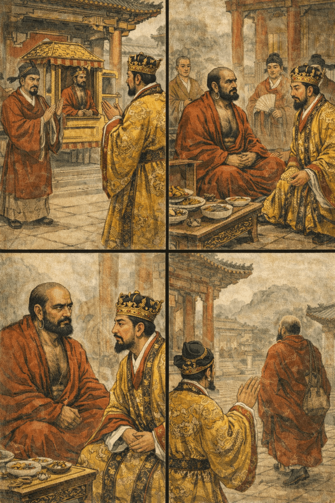 梁武帝親迎於宮闕門口,就地拱手作揖,攜法師入內休息,早已吩咐準備好齋菜供養大師,待法師用齋完畢,還提供珍品妙釀給法師品嚐。