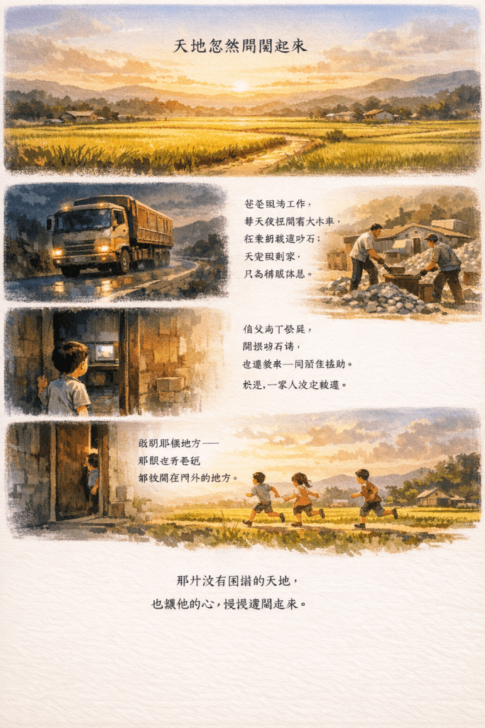 爸爸因為工作,每天夜裡開著大卡車,往東部載運砂石;天亮回到家,只為補眠休息。