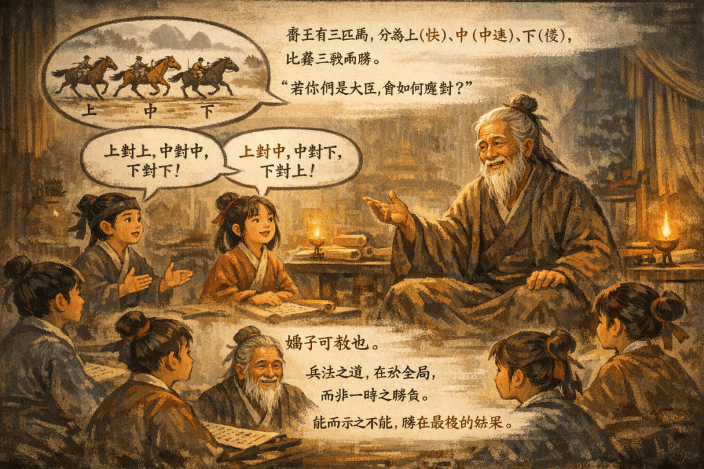 為了讓學生理解兵法的精髓,師傅講起一則故事——齊王與大臣賽馬。