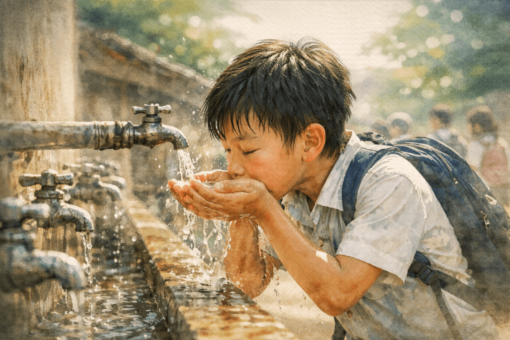 口渴時,直接打開水龍頭,用手掬起水,仰頭就喝——